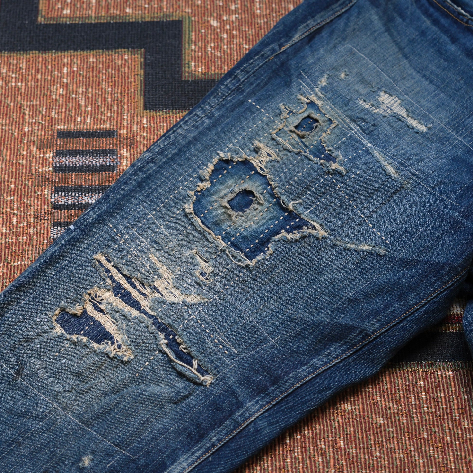 • Hard-worn Remake Finishing: Finished with overall dark aging and bleach processing featuring intense distressing throughout and multiple fabric patches for a patchwork remake